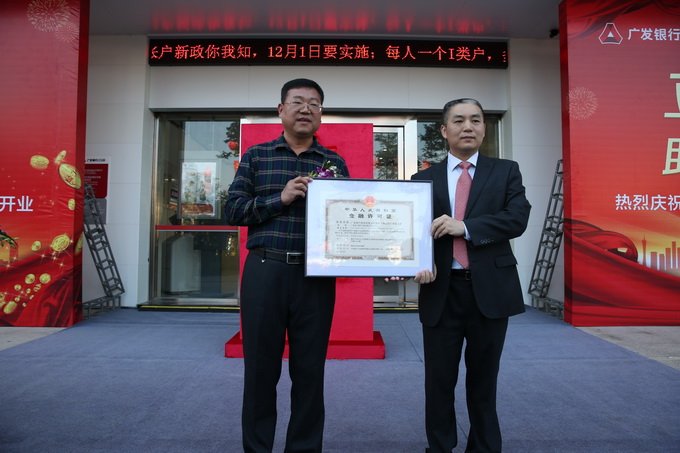 儀式上,副市長劉端雄及廣發(fā)銀行總行副行長宗樂新等共同為廣發(fā)銀行揭陽中德支行揭牌。揭陽銀監(jiān)分局局長王學(xué)臣向中德支行行長陳凱鴻授支行《金融許可證》。