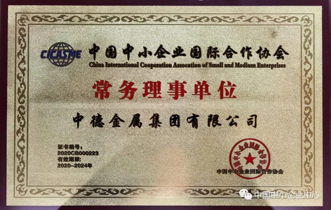 憑借在助推中小企業(yè)對外合作和創(chuàng)新發(fā)展方面的不懈努力和突出成績,中德金屬集團獲選中國中小企業(yè)國際合作協(xié)會常務理事單位,這是國家級行業(yè)協(xié)會對中德金屬集團服務中歐中小企業(yè)雙向合作工作的高度認可,也是對集團在中小企業(yè)創(chuàng)新發(fā)展工作中突出貢獻的充分肯定,意味著中德金屬集團將更好地為國內中小企業(yè)提供更大的合作平臺和海內外資源。