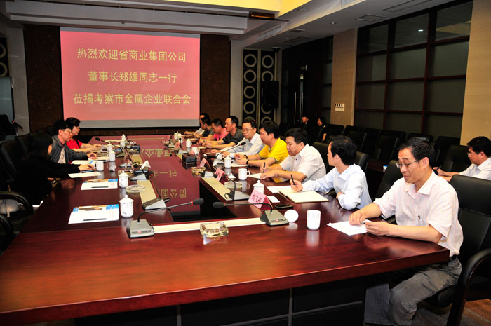 2013年5月16日,廣東省商業(yè)企業(yè)集團(tuán)公司黨委書記、董事長鄭雄、廣東省商業(yè)企業(yè)集團(tuán)公司副總經(jīng)理顧小蓉、廣東省拍賣業(yè)協(xié)會監(jiān)事長林朝暉等領(lǐng)導(dǎo)蒞揭考察揭陽市金屬企業(yè)聯(lián)合會,揭陽市政府副秘書長鄭旭亮、揭陽市國資委主任朱享生陪同參觀。
