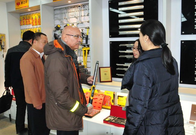 施泰格參觀金屬制品展廳的推介產(chǎn)品,聽取揭陽先進(jìn)企業(yè)的發(fā)展情況介紹