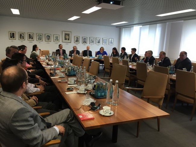 斯泰格爾基金會主席斯泰格爾先生和德國聯(lián)邦雇主協(xié)會原會長迪特•洪德博士應邀出席。中德金屬集團有限公司副總裁白致東帶代表團一行8人專程與會。來自高檔環(huán)保電動車、醫(yī)療器械以及電鍍化學等行業(yè)的近30名中德相關(guān)協(xié)會代表及企業(yè)家到場,推介會氣氛熱烈。