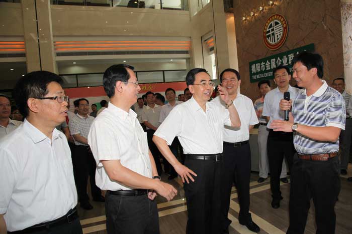 陳東市長簡要的介紹了揭陽市近年來金屬產(chǎn)業(yè)發(fā)展和金屬產(chǎn)業(yè)轉(zhuǎn)型升級的概況,吳克東會長詳細(xì)介紹揭陽金屬城建設(shè)、規(guī)劃、開發(fā)的情況,隨后朱小丹省長觀看了《產(chǎn)業(yè)復(fù)興,輝煌崛起——揭陽金屬產(chǎn)業(yè)20年巡禮》宣傳片,他對揭陽金屬產(chǎn)業(yè)自主創(chuàng)新模式給予充分肯定,希望揭陽繼續(xù)發(fā)揮金屬產(chǎn)業(yè)集群的優(yōu)勢,不斷提升自主創(chuàng)新,打響自主品牌,培養(yǎng)龍頭企業(yè),為加快產(chǎn)業(yè)轉(zhuǎn)型升級,建設(shè)幸福廣東作出新貢獻(xiàn)。