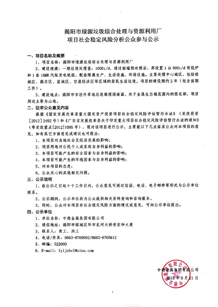 當前位置:首頁 > 新聞中心 > 公司新聞 > 揭陽市綠源垃圾綜合處理與資源利用廠項目社會穩(wěn)定風險分析公眾參與公示