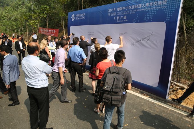 通過實(shí)地考察和聽取情況介紹,德國中小企業(yè)經(jīng)理人對中德金屬生態(tài)城表現(xiàn)出濃厚興趣。在開班儀式后,他們來到了中德金屬生態(tài)城萬畝森林公園植下中德友誼之樹,并在留言墻上寫下寄語。MAE中德咨詢公司執(zhí)行董事馬恩工工整整地寫下“中德合作共贏”六個(gè)漢字,而CNGE國際咨詢責(zé)任有限公司首席執(zhí)行官托馬斯。諾爾廷則用“非常好”的拼音表達(dá)了他對中德金屬生態(tài)城的印象!拔覀儠僖姷模谊!”留言墻上記錄了德國中小企業(yè)經(jīng)理人的熱切期待和美好愿景。