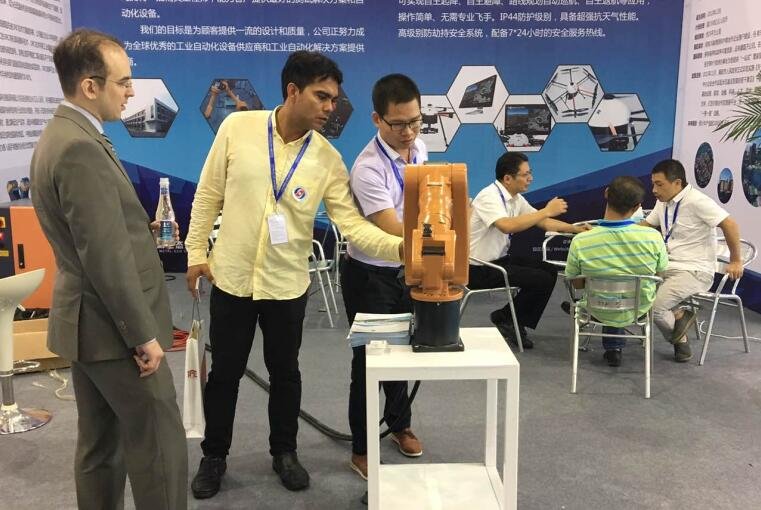 加德偉公司的智能機械臂引起境外采購商的注意。圖為公司參展負責人現(xiàn)場展示產(chǎn)品功能