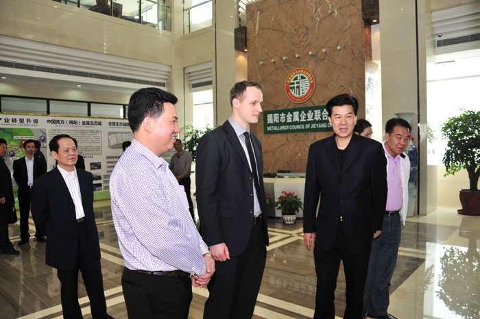 3月18日,德國沙爾平戰(zhàn)略發(fā)展咨詢有限公司代表杰瑞海德曼參觀調(diào)研揭陽市金屬企業(yè)聯(lián)合會,揭陽市政協(xié)副主席、市長助理陳定雄,揭陽市外經(jīng)貿(mào)局局長盧培群、揭東區(qū)副區(qū)長林炳華、揭陽市金屬企業(yè)聯(lián)合會執(zhí)行會長林耿興、林眾偉共同出席座談會。