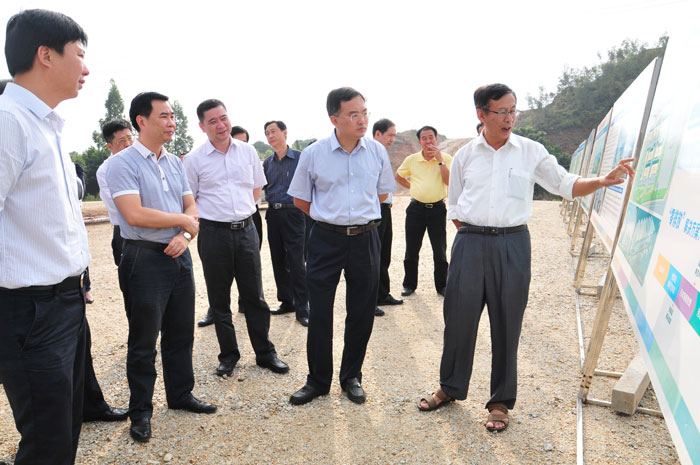 揭陽市常務(wù)副市長陳澄民向潮州副市長盧淳杰一行介紹生態(tài)城首期工程建設(shè)情況