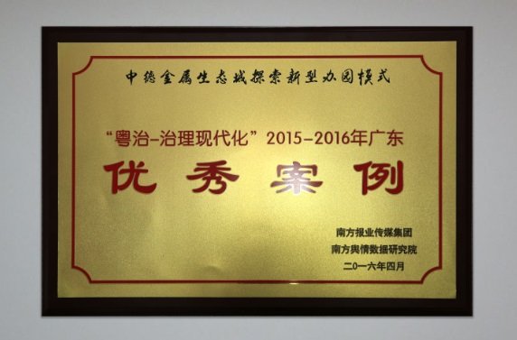 2016年4月26日,第三屆“粵治一治現(xiàn)代化”廣東探索經(jīng)驗交流會在南方報經(jīng)業(yè)傳媒集團舉行。在同時發(fā)布的2015-2016年度“粵治——治理現(xiàn)代化”優(yōu)秀案例中,來自廣東揭陽的中德金屬生態(tài)城榜上有名。